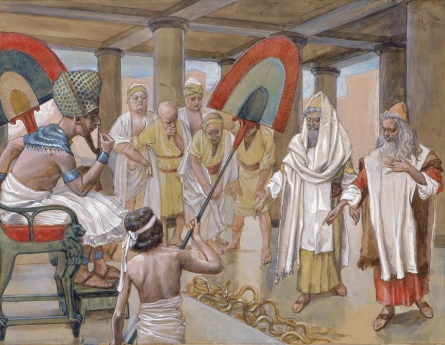 Then Aaron threw down his rod, and it was turned into a snake. But there were wise men in Egypt who had heard of this; and they made ready a trick. They threw down their rods, and their rods became snakes, or seemed to. They may have been tame snakes, which they had hidden under their long garments, and then brought out, as if they had been rods.